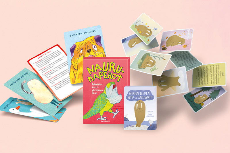 Naurunaperot — Toimintakortit yhteiseen iloon sekä Mursun lempeät keho- ja mielikortit tukevat lapsen hyvinvointia ilon, liikkeen, huumorin ja rauhoittumisen kautta. Paketti tarjoaa kasvattajille konkreettisia, tutkittuun tietoon pohjautuvia työkaluja, joiden avulla arkeen voidaan tuoda sekä naurua että lempeää kehon kuuntelua.