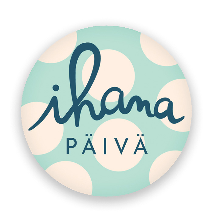 Magneetissa tummansinisellä teksti "Ihana päivä", sekä turkoosi tausta jossa valkoisia palloja.